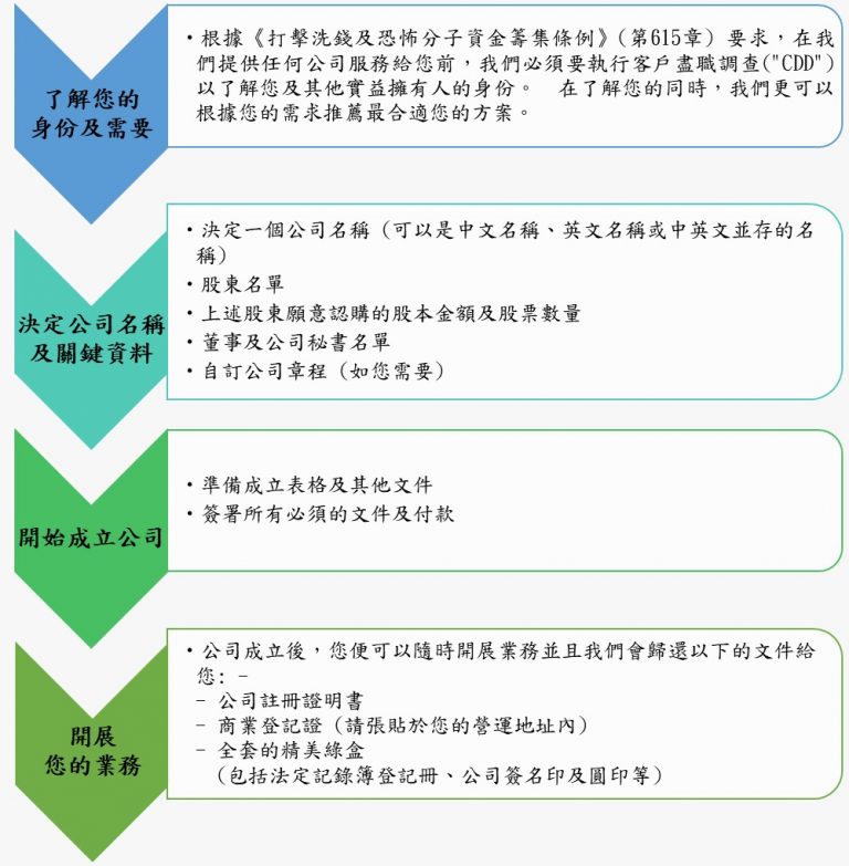 如閣下已決定成立香港私人有限公司,請填妥成立公司表格問卷,並提供預備成立的公司之基本資料,例如公司名字、股東及董事名單。